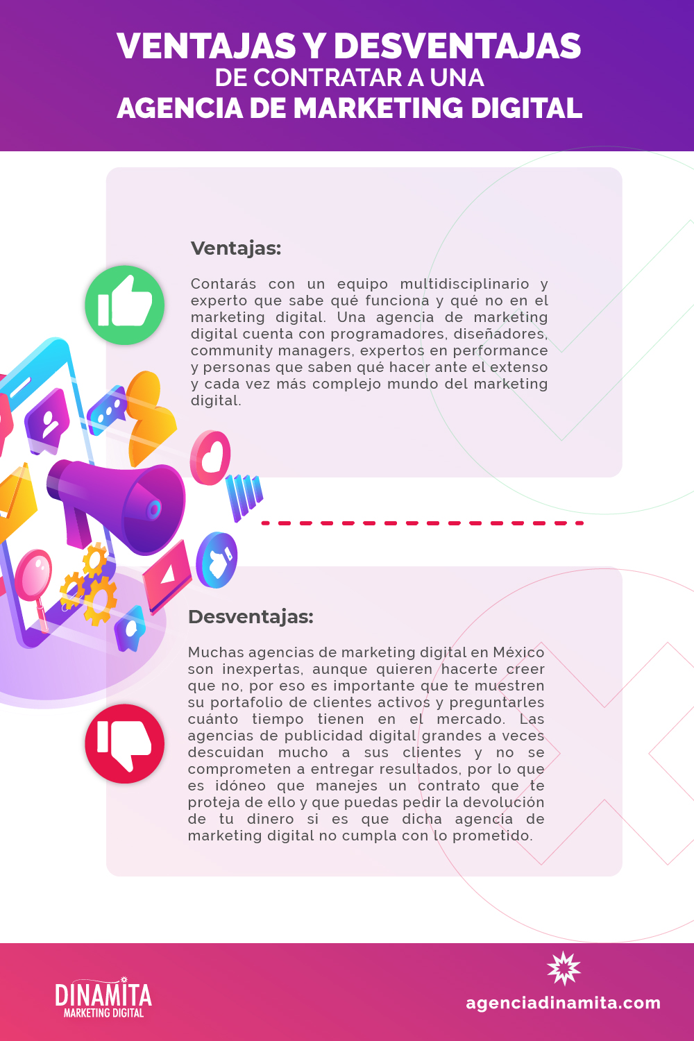 Desventajas: Muchas agencias de marketing digital en México son inexpertas, aunque quieren hacerte creer que no, por eso es importante que te muestren su portafolio de clientes activos y preguntarles cuánto tiempo tienen en el mercado. Las agencias de publicidad digital grandes a veces descuidan mucho a sus clientes y no se comprometen a entregar resultados, por lo que es idóneo que manejes un contrato que te proteja de ello y que puedas pedir la devolución de tu dinero si es que dicha agencia de marketing digital no cumpla con lo prometido.